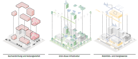 Neben einer baulichen Entwicklung bedeutet Innenentwicklung aber auch, dass Grünstrukturen und eine nachhaltige Mobilität weiterentwickelt werden. Alle drei Aspekte gemeinsam bezeichnet man als dreifache Innentwicklung.